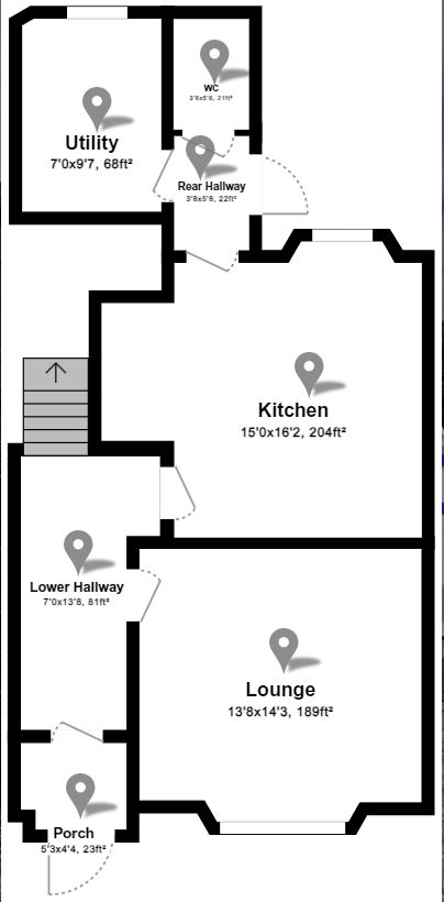A Ground floor WC is located off the rear hallway. The WC comprises of a close coupled WC and a basin with mixer tap. A window to the side provides ample daylight. The walls are emulsioned and the flooring is tile.